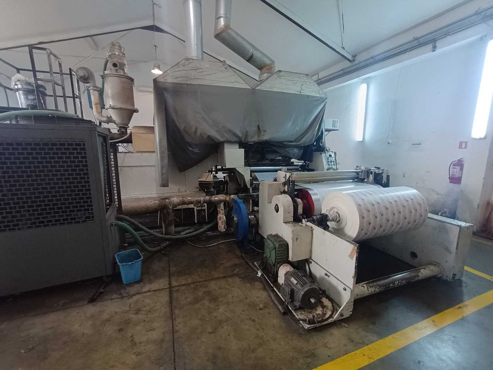 Plastic Film Processing Machine General data: Machine type: Plastic film processing line Manufacturer: Unknown Model: Unknown Year of manufacture: Unknown Serial number: Unknown Condition: Used Weight: approx. 8000 kg Dimensions (L x W x H): approx. 6000 x 2500 x 3500 mm Technical details: Power: Unknown Includes unwinding and rewinding stations Multiple heated zones Control panel with temperature regulators Ventilation hood and cooling system Description: Industrial plastic film processing line designed for converting plastic rolls into finished or semi-finished film products. The machine operates through heating, shaping, and rewinding processes and is typically used for applications such as polyethylene film embossing, perforation, or lamination. Auction-ID: A7-45365-1