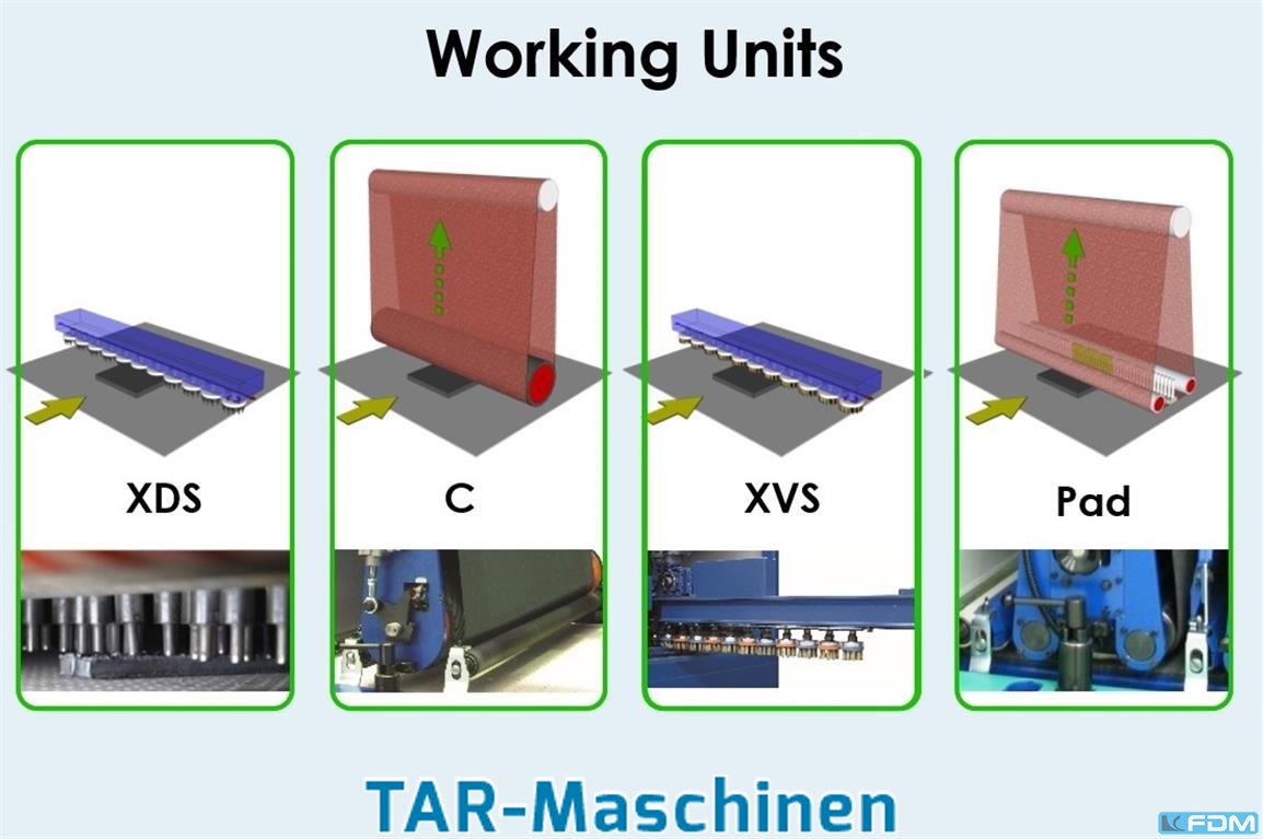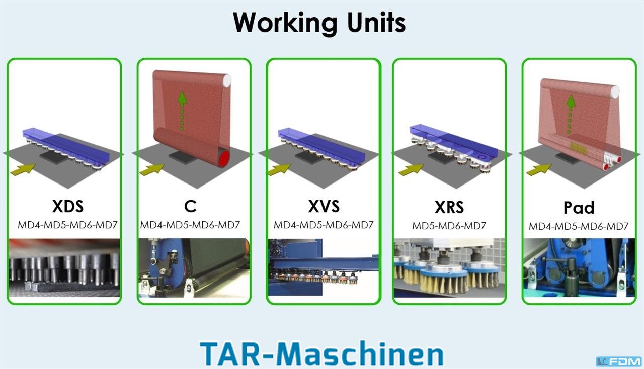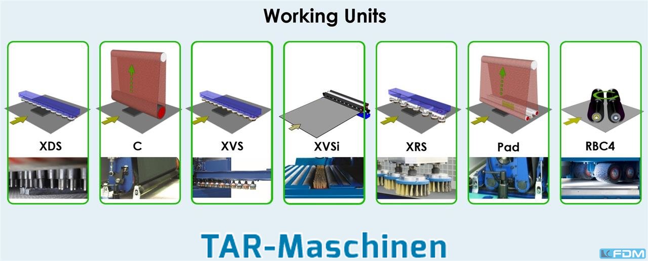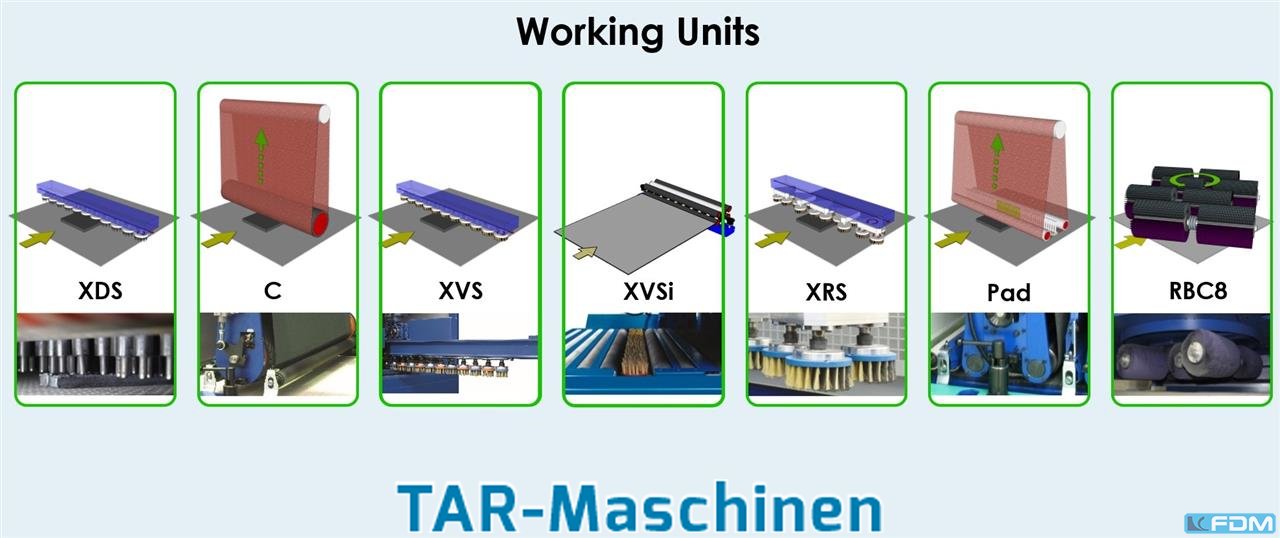 Deburring and fine grinding machine for sheet metal / flat material, newThe compact machining centre for deburring, slag removal, rust removal, oxide layer removal, edge rounding, fine grinding through to polishing metal surfaces.Working height: variable from 0,5mm ? 150mm adjustableWorking width: 1150 mmMaximum part weight: 300 kgWide belts with abrasive belt unwinding: 2200 mmAs standard with vacuum hold system, optional with magnetic hold systemDue to the modular design of the machines, it is possible to offer the optimal configuration for the customer's machining task.The machine structure can accommodate up to 3 internal machining units and an additional external machining unit.Please, contact us for getting more information and pictures on mail(at)tar-mc.com or www.tar-mc.com