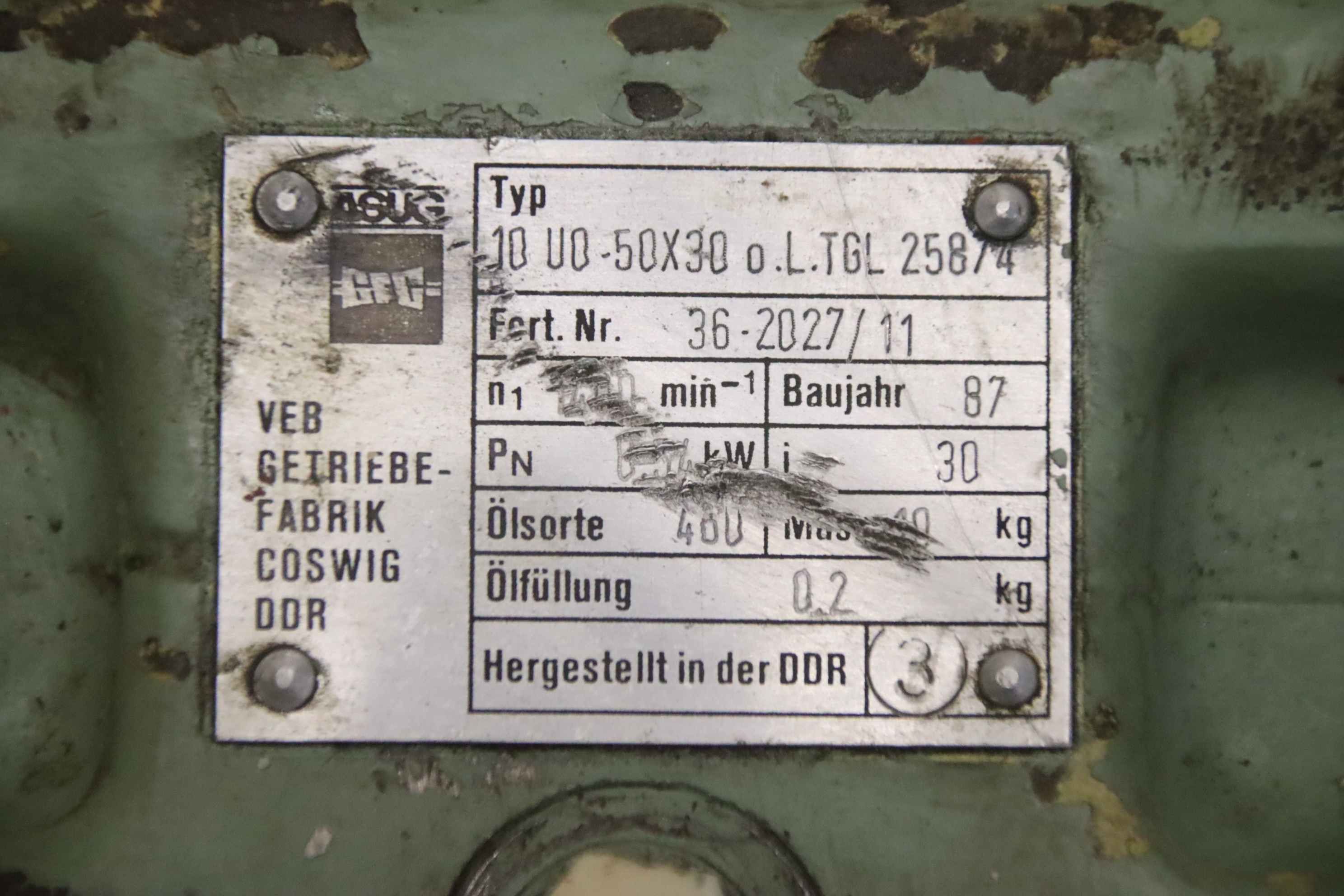 Gearbox, spur gear, angle gear, worm gear, adjustable gear motor-Manufacturer: VEB, type 10 UO-50x30 oLTGL 258/4-Translation: i = 30-Shafts: Ø 25 x 60 mm / Ø 14 x 30 mm-Number: 1x gearbox available-Price per piece-Dimensions: 200/180/H170mm-Weight: 9 ...