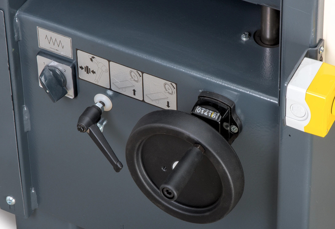 Working width: 410 mm; Planing shaft: spiral shaft ; Number of knives: 66; dressing table length: 2020 mm; Dressing stop angle adjustable: yes 45Â to 90Â; maximum clearance thickness planer: 230 mm; Height adjustment thickness table: handwheel; Display of planing strength: mechanical digital display; Feed speed: 5.5 / 10 m/min; Feed roller: steel; Pull-out roller: steel; Table rollers: no; Motor power: 5.3 kW; Engine brake: yes, automatic; Suction port: 100mm; Machine length: 2020 mm; Machine width: 882 mm; Weight: 480kg;