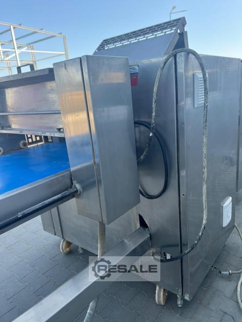 Linha de folhagem de pastelaria Rondo Laminazione 2001, inoxidável, comprimento total de 7000mm, esta linha compreende uma secção de infeed – cabeça de satélite multi rolo, pinner transversal e, em seguida, calibrador fazendo massa folhada de blocos/billets até largura final de 600 mm e 2-3mm de espessura, vem completo com desenhos elétricos e manuais.
